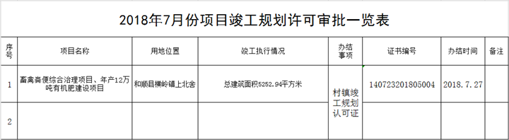 2018年7月份项目竣工规划许可审批一览表