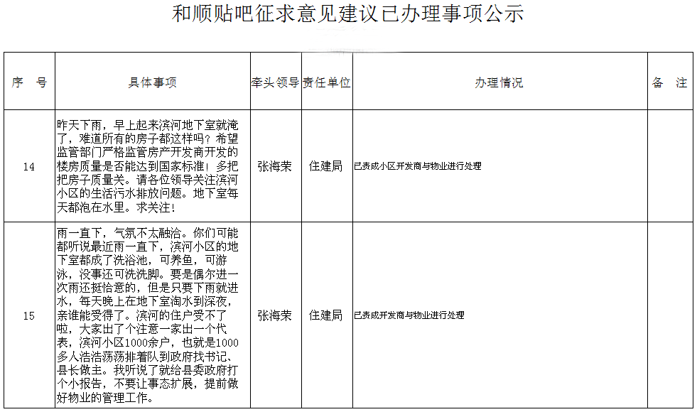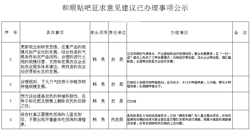今年7月份以来,以民生改善为主题的第五次征求意见活动,得到了广大干部群众和网民朋友的热情参与,共从科级干部与和顺贴吧征求到涉及经济发展、农业农村工作、就业与社会保障、医疗卫生等13个方面1840余条意见和建议。经过一段时间的汇总、梳理、归类,我们把征集到的意见和建议逐项逐条分解到牵头领导和责任单位,并在今年9月份首次通过政府网站、和顺贴吧、政务微博等渠道,对第五次征求意见建议办理情况进行了公示。按照“一月一公示,一月一回复”的要求,在牵头领导和责任单位的共同努力下,我们再次把征求意见建议已办结事项进行公示,热诚接受大家的监督评议。