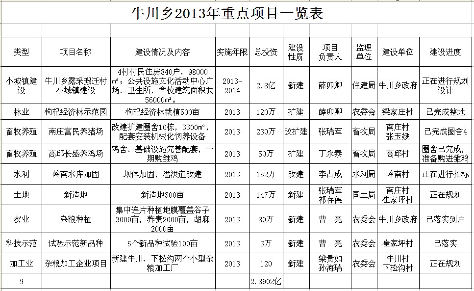牛川乡2013年重点项目建设情况